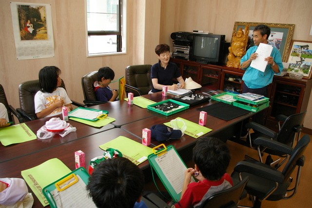 (左)地元小学生の会社見学の様子。レンズの役割について実物を見てもらいながら説明中。